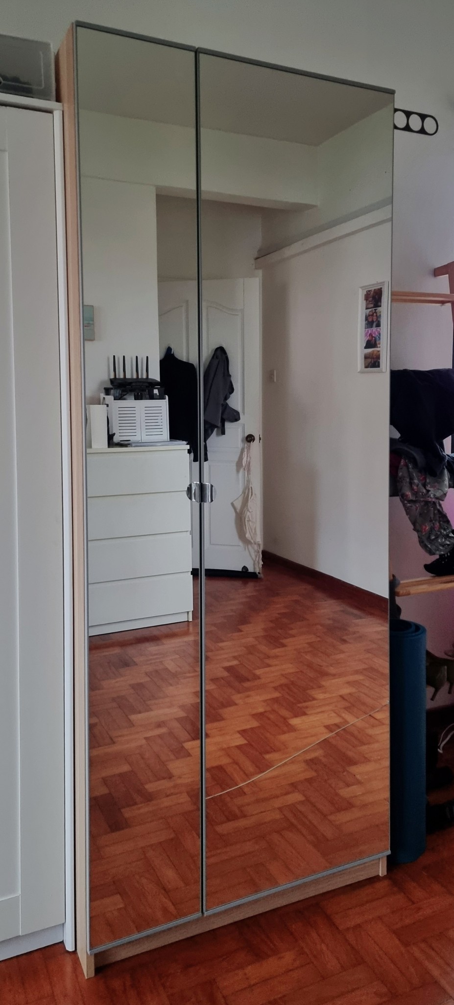 While there is a crack on the mirror glass on the lower part of the larger door, it is still super usable! There is no sign of the cracked mirror falling off so safety is not a concern. The cracked corner is also not sharp.