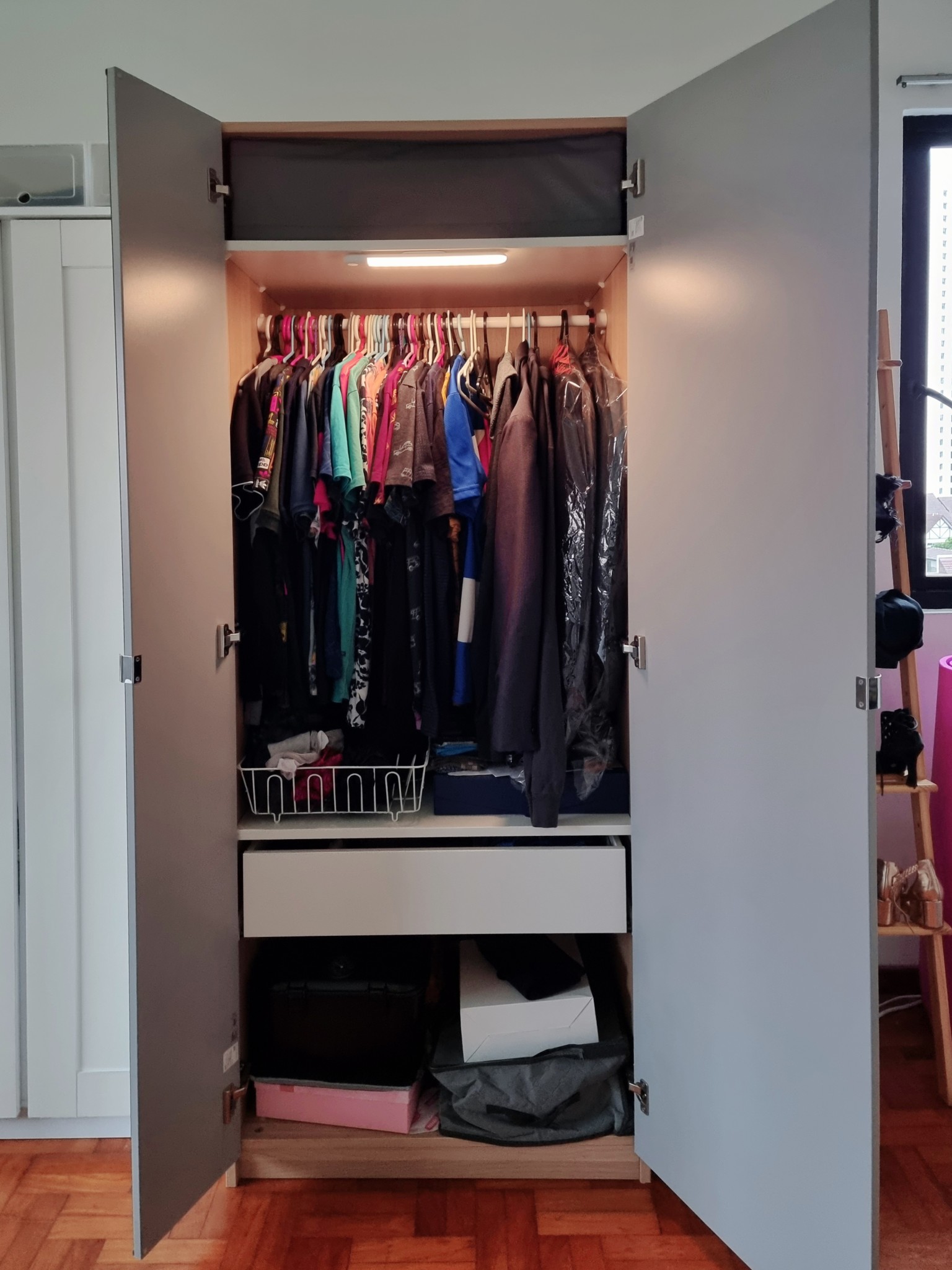 Custom equipped with a motion-sensor rechargeable light, you'll never have to worry about opening the wardrobe in the right angle with the light.