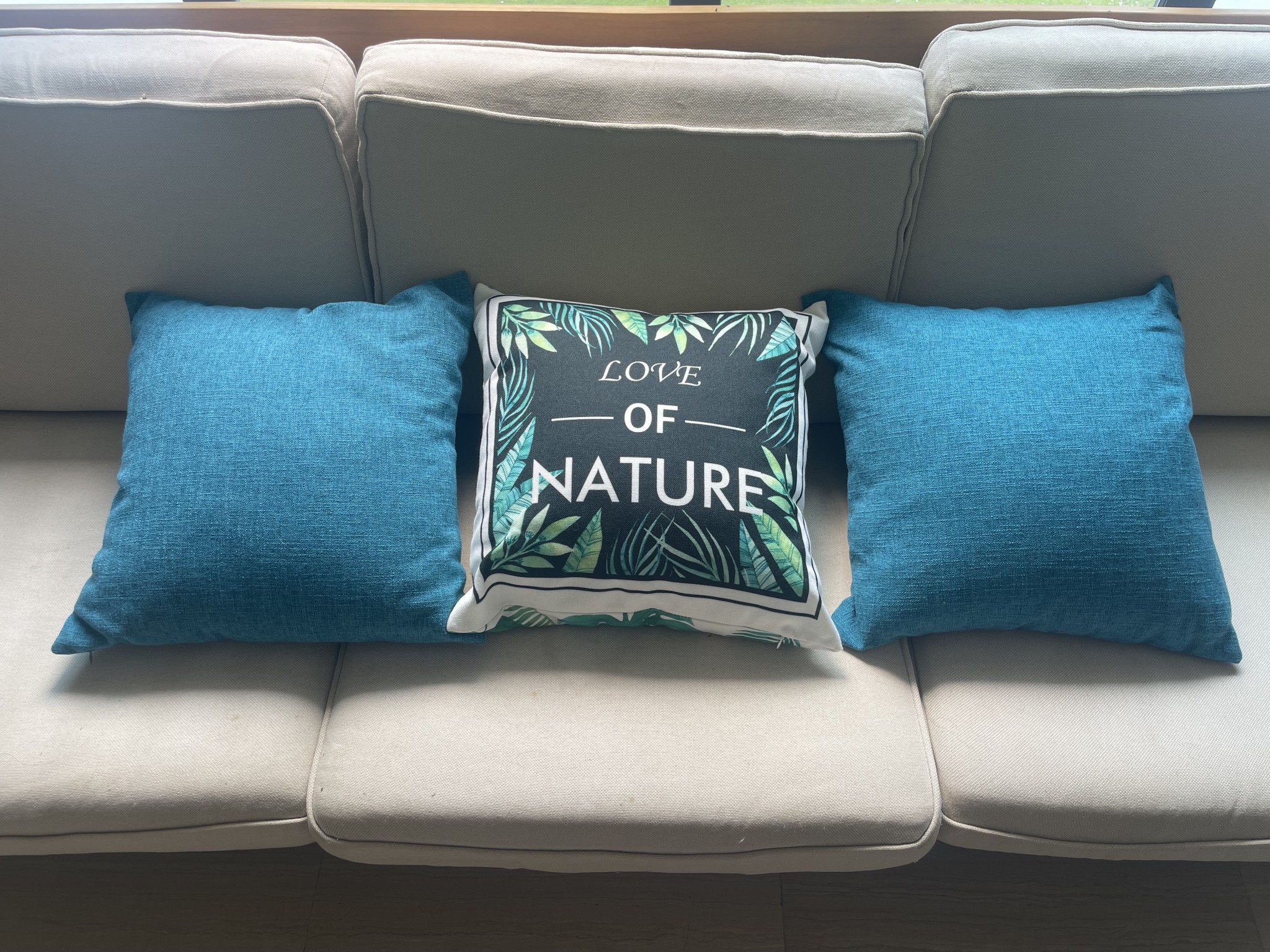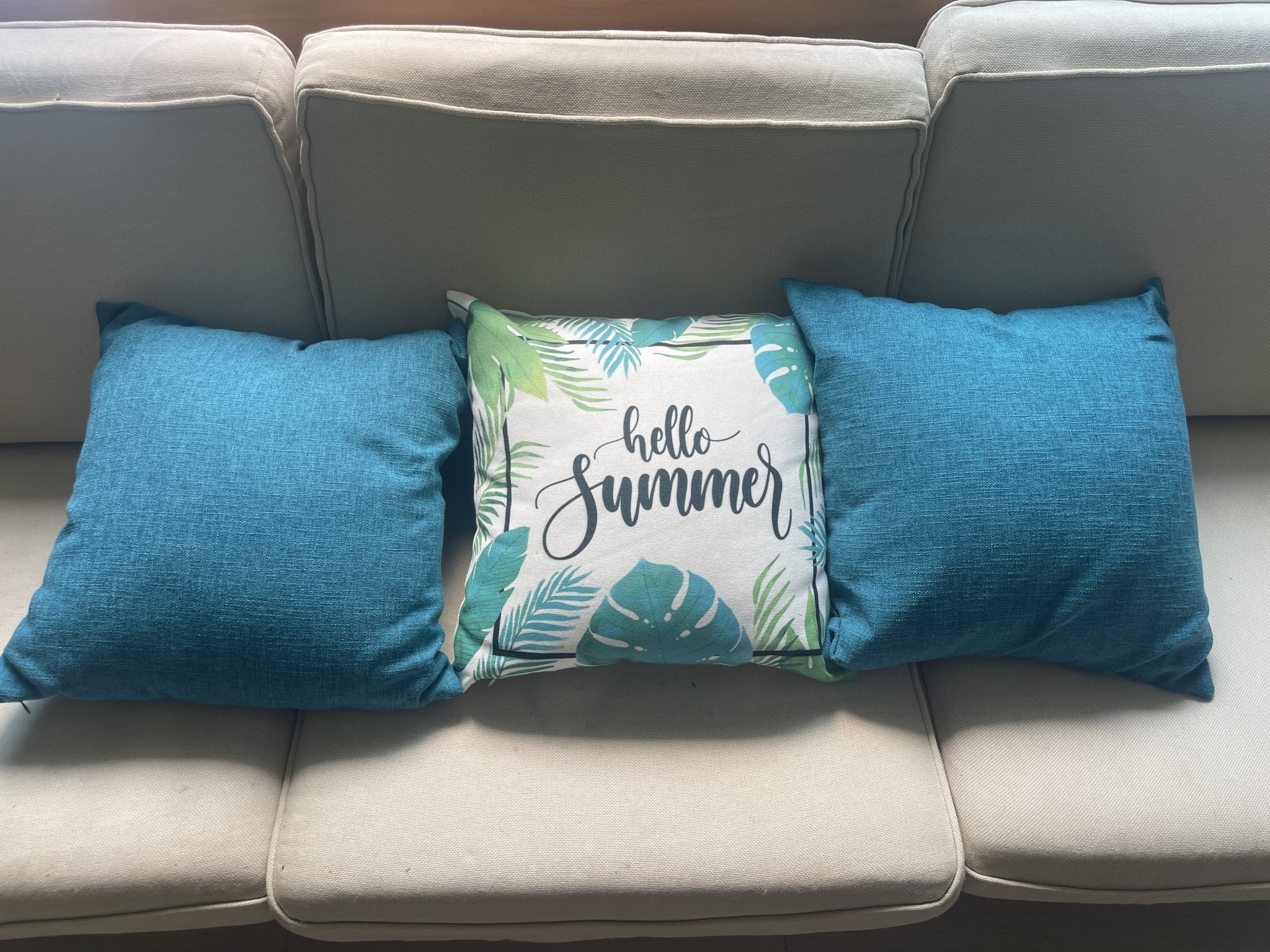 3 square pillows 2 blue pillows + 1 pillow with 2 designs Stock Status: 1 pcs Delivery Status: Pickup Only Recommended Price: S$62 S$62 S$20 Excluding Tax Description If you want that I can also give for free a Jar for flowers in the same blue tone :)